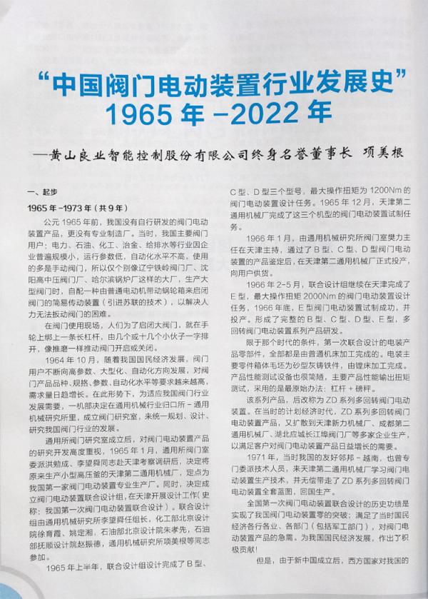 由黃山良業(yè)項(xiàng)美根名譽(yù)董事長(zhǎng)撰寫(xiě)的論文《中國(guó)閥門(mén)電動(dòng)裝置行業(yè)發(fā)展史——1965-2021》繼2021年2月、4月在《閥門(mén)用戶(hù)》發(fā)表后,在業(yè)內(nèi)產(chǎn)生強(qiáng)烈的反響。之后《中國(guó)通用機(jī)械》雜志也選用該論文,并連續(xù)刊登在2021年12月第6期,2022年第1、2期上。近日又被《閥門(mén)》雜志社選用刊登在《閥門(mén)》雜志2022年第3期上,讓更多的讀者了解我國(guó)閥門(mén)電裝的發(fā)展歷程,并提供豐富的珍貴歷史資料。