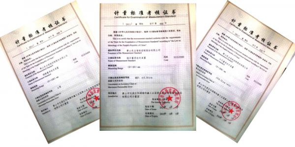 公司根據(jù)市場的變化,本著客戶至上,質(zhì)量*的原則,公司領導為了更好的確保產(chǎn)品質(zhì)量,于2007年籌建了公司長度量具檢測計量室,并于2008年順利通過了黃山市市場監(jiān)督管理局的考核,取得了“指示量具檢定裝置”、“測微量具檢定裝置”、“卡尺量具檢定裝置”三個長度計量標準的考核證書。該計量室的建立為公司產(chǎn)品質(zhì)量的提升提供了堅實的保障,量值有了可追溯性,極大的提高了公司產(chǎn)品質(zhì)量。