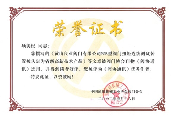 黃山良業(yè)閥門(mén)有限公司董事長(zhǎng)項(xiàng)美根榮獲中國(guó)閥協(xié)刊物《閥協(xié)通訊》優(yōu)秀作者稱(chēng)號(hào)