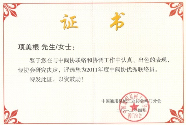 項(xiàng)美根董事長(zhǎng)被評(píng)為“2011年度中閥協(xié)優(yōu)秀聯(lián)絡(luò)員”