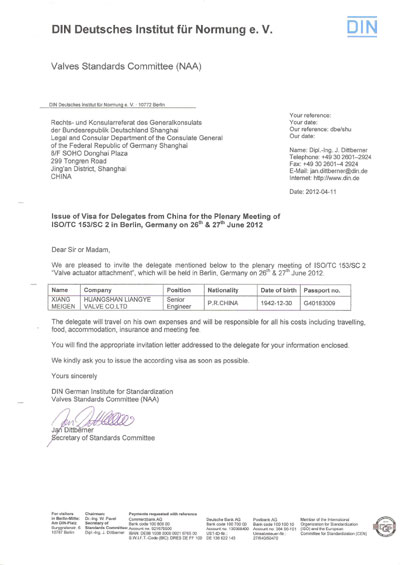 項美根董事長將應邀出席德國柏林召開的國際閥門標準化會議
