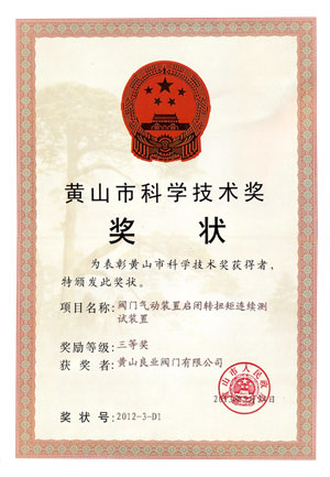 泵閥交易網(wǎng)訊 黃山良業(yè)閥門有限公司研制的“閥門氣動裝置啟閉轉(zhuǎn)矩連續(xù)測試裝置”因其有多項技術(shù)創(chuàng)新和國家專利,并經(jīng)用戶使用證明具有良好的市場前景,最近經(jīng)黃山市科技局評審,榮獲2011-2012年度黃山市科學(xué)技術(shù)進(jìn)步三等獎證書。